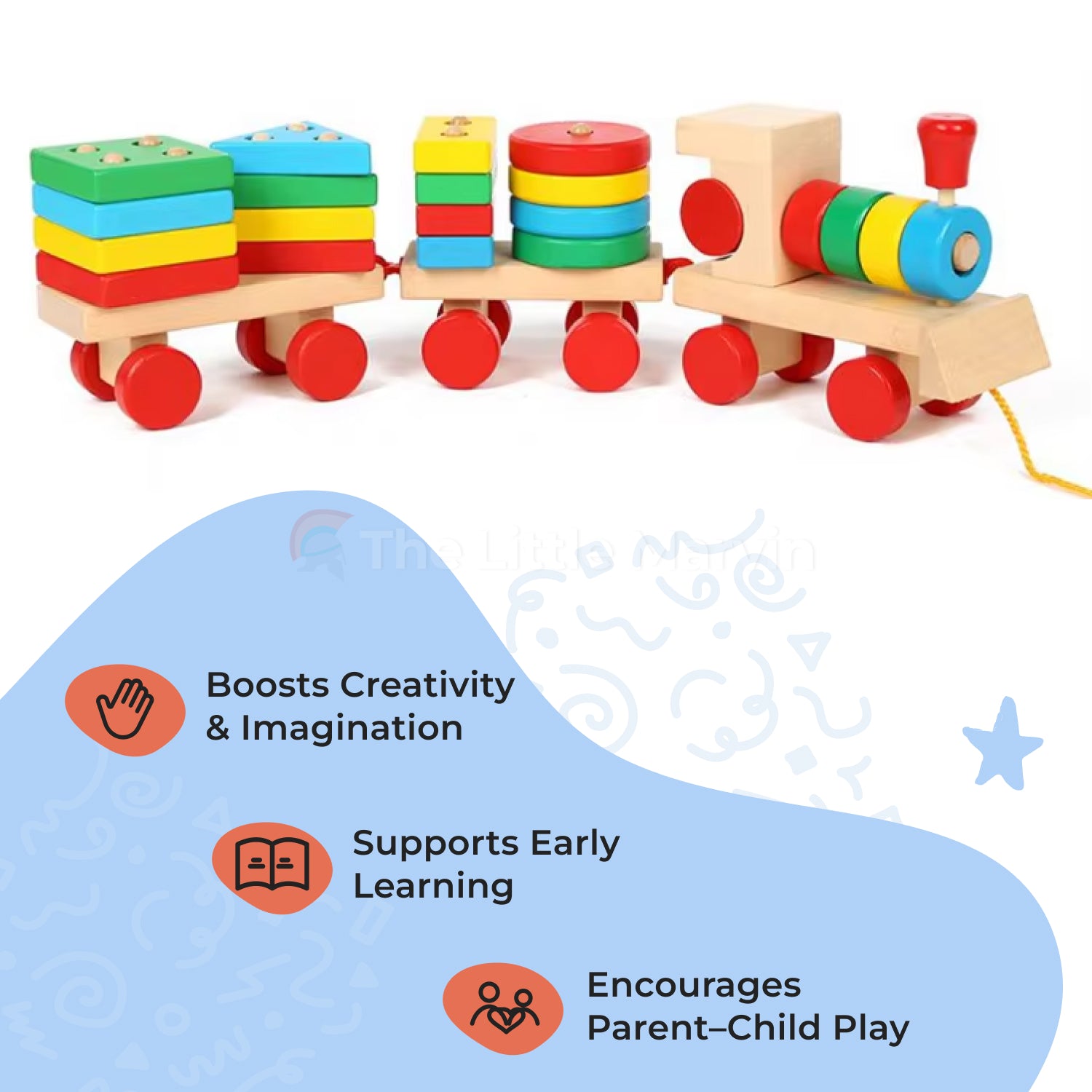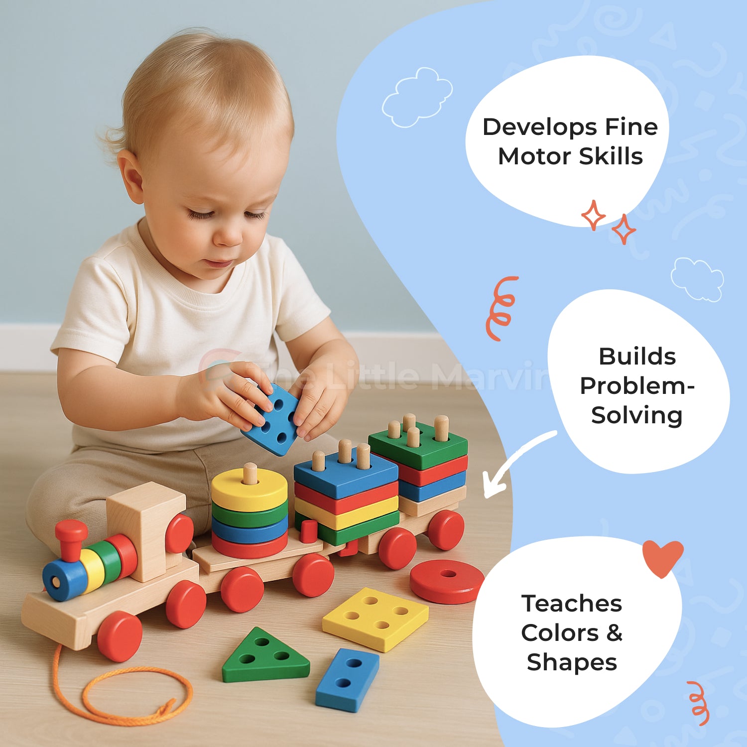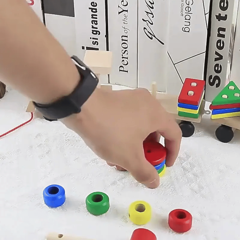 Marvin’s Wooden Train – is a Montessori-inspired toy that helps kids learn colors, shapes, and problem-solving while developing fine motor skills through interactive play.
